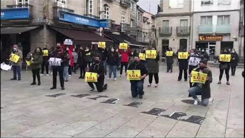 Los hosteleros de Xinzo de Limia salen a la calle con motivo del paso de La Vuelta ciclista a España por la localidad para protestar por la situación actual de sus negocios. Tras el anuncio de la Xunta, la hostelería deberá cerrar sus puertas durante un mes a partir de este sábado.