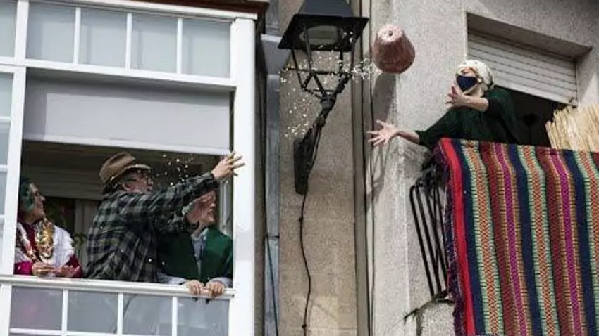 Una plaza casi desierta donde las miradas trepaban por los balcones. Algunos atrevidos lanzaban las olas al aire, de una ventana a otra, mientras abajo un puñado de niños hacían lo propio. En el centro, el Meco colgado y rindiendo homenaje -de alguna forma- al Domingo Oleiro. Iván Prado, de la organización entroideira asegura que todo lo que pueda haber por la calle "será espontáneo".