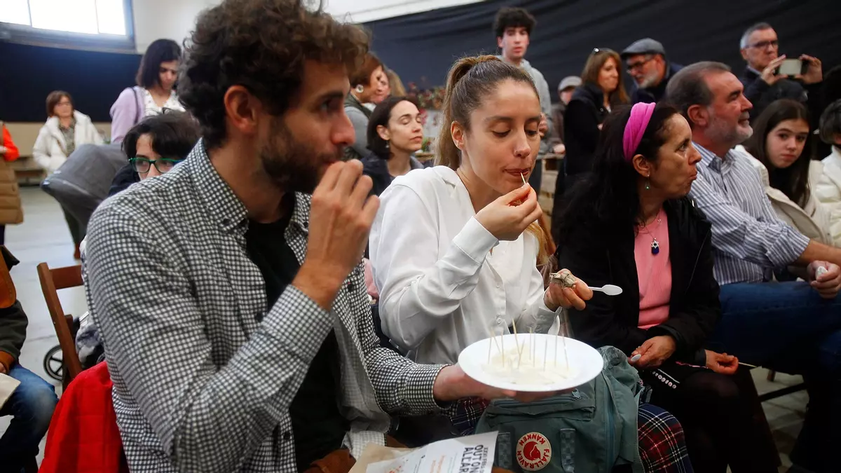 El postre se adelantó a la comida este domingo en Allariz, cortesía de los profesionales queseros del Ecoespazo do Rexo. Manola Suárez y Héctor Vaquerizo fueron los encargados de presentar, en el marco de la Feira de Outono, una nueva creación que aspira a formar parte de las sobremesas gallegas y cuyo sabor, muy alaricano, es el resultado de la colaboración entre O Rexo, Ecoleia -productores de leche ecológica- y Petelos -dedicados a la elaboración de productos con base de castaña-. Se trata del “yogurt de leite de ovella e leite de vaca sobre base de crema de castaña” que, si la aceptación es la esperada, se comercializará a lo largo de 2023.