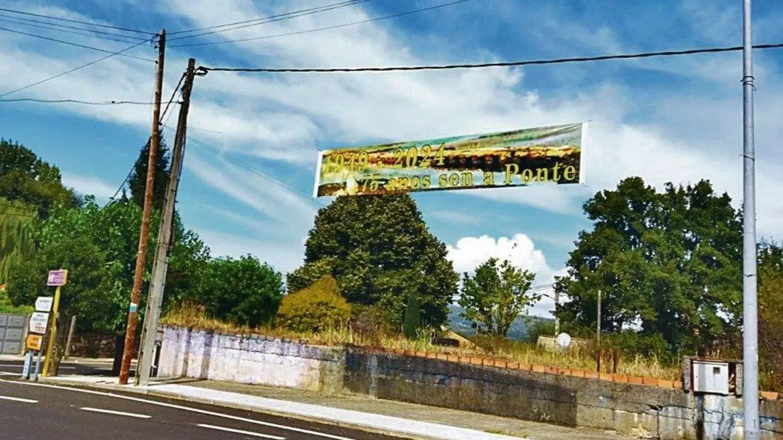 Una pancarta instalada este verano en Mugueimes recuerda los 75 años de la construcción del embalse de As Conchas y, con ello, la desaparición del emblemático “poldrado” y lo que supuso en las relaciones socioeconómicas entre ambos márgenes del Limia.