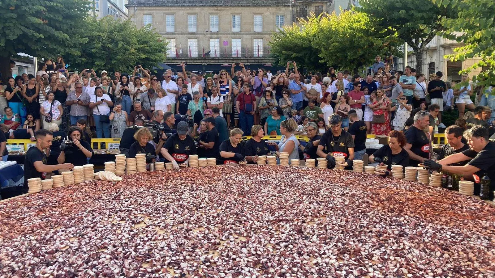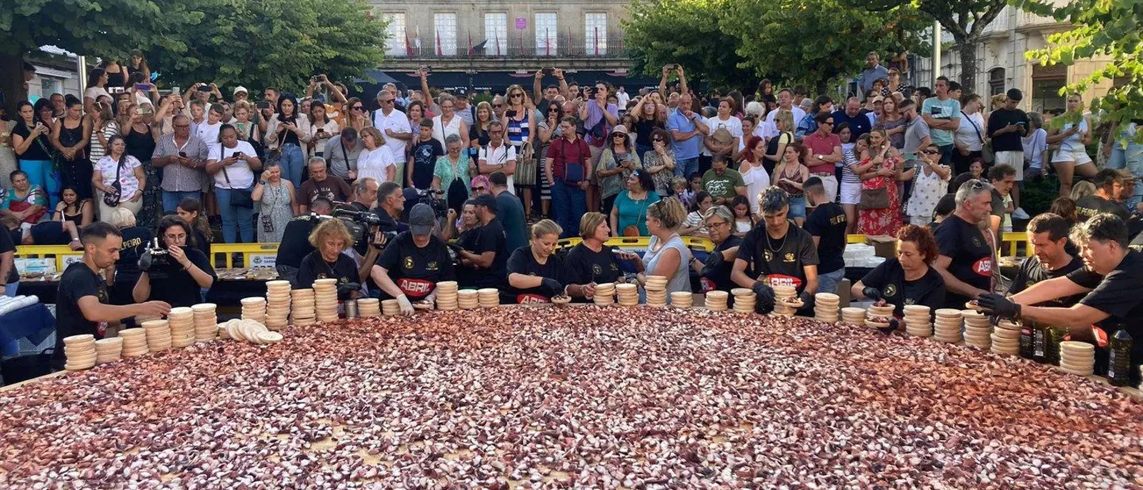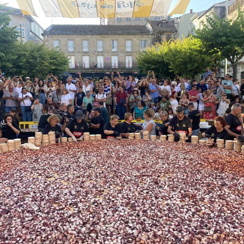 La Praza Maior de O Carballiño fue el contexto del nuevo récord de la tapa de pulpo más grande del mundo, conseguido este miércoles. Con la nueva marca, en la que fueron preparados 590 kilos del cefalópodo en poco más de diez minutos, ya es la número 14 que acumula la celebración.