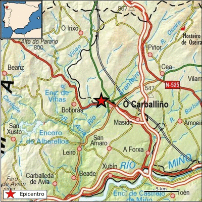 El IGN informó que el epicentro del terremoto, registrado a las 00,47 horas del martes, fue a cinco kilómetros de profundidad en el municipio carballiñés. Un seísmo de magnitud 1.6 que no se sintió en otros concellos de la provincia.