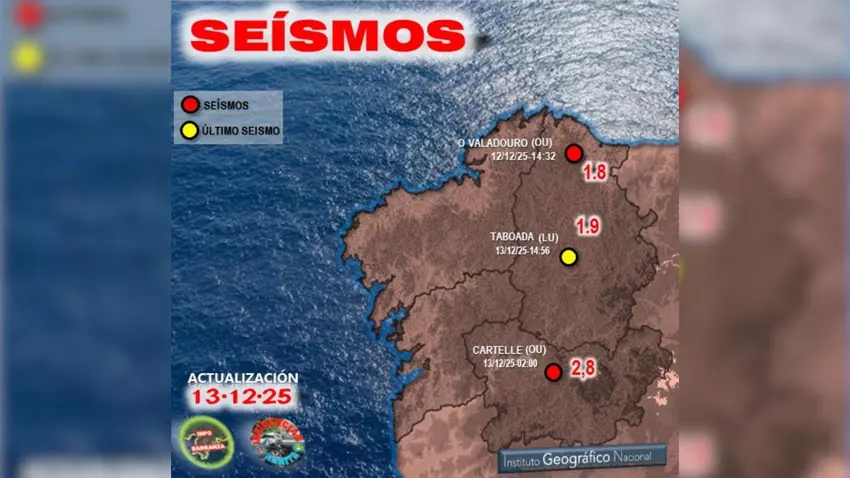 Esta madrugada, a las 2:00 horas, se registró un terremoto en Cartelle, según los datos oficiales del Instituto Geográfico Nacional. El movimiento sísmico, con una magnitud de 2,8 mbLg, se produjo en la zona noroeste del municipio y tuvo lugar a las 01:00 UTC del 13 de diciembre de 2025.