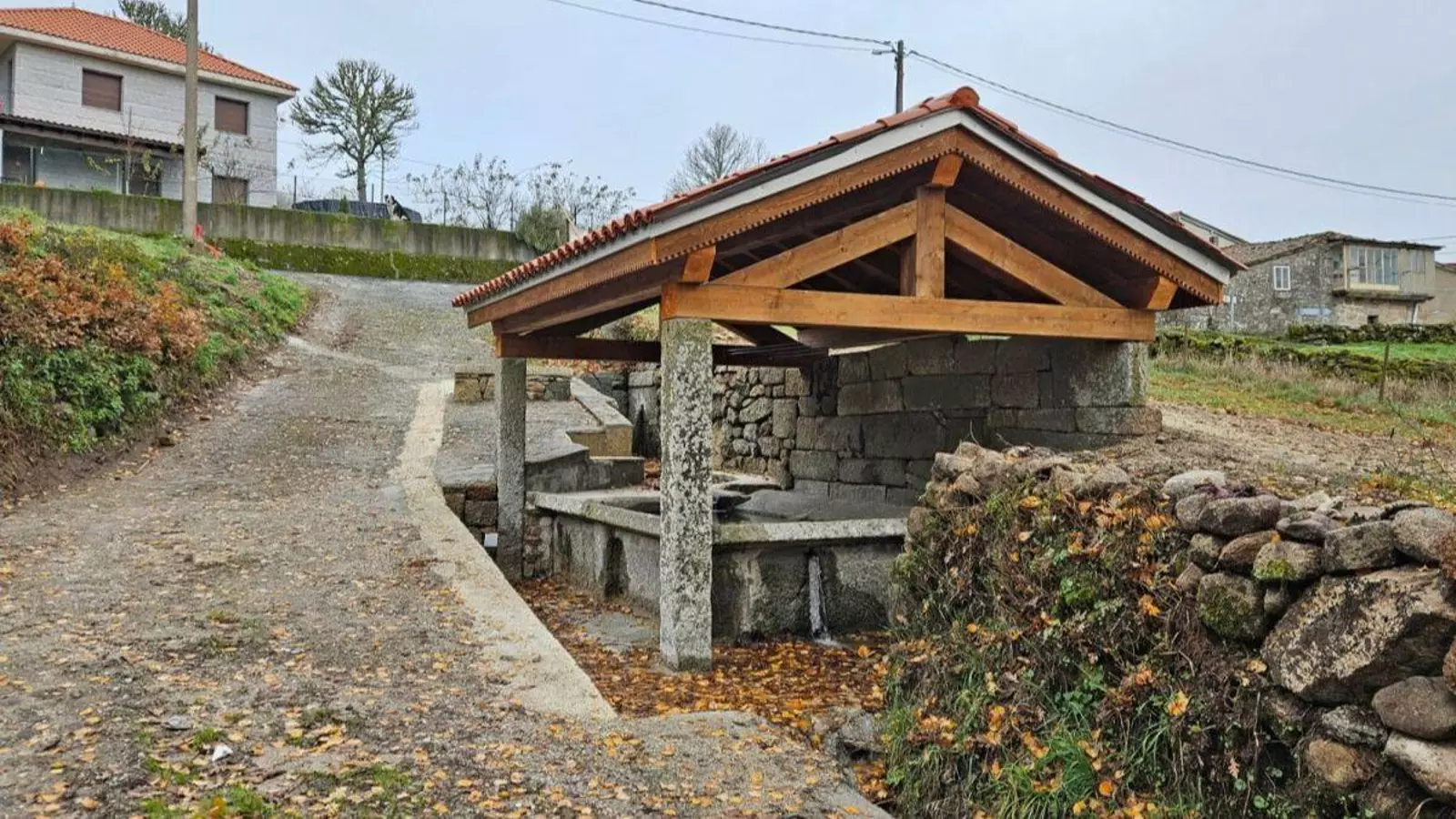 Debido al estado de deterioro de la cubierta existente, se procedió a su renovación completa, incorporando una nueva estructura de madera laminada y teja cerámica, así como las cuerdas para tender. Además, se amplió y pavimentó el espacio en torno al lavadero, mejorando la accesibilidad. Con el objetivo de reforzar el carácter público del conjunto, se instaló un banco de granito, que también actúa como protección, y una escalera que facilita el acceso al canal y a la fuente. Emplearon materiales tradicionales, como granito en muros, bancos y pavimentos, cuidando los acabados en aleros y vigas mediante elementos de madera.