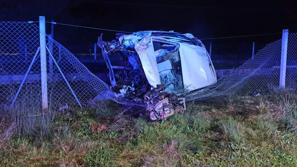 Estado en el que quedó el coche que conducía el fallecido tras chocar con un poste eléctrico. en Verín