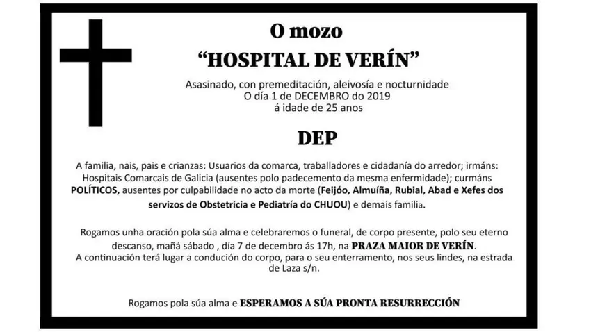 A las cinco de la tarde, esa hora tan castiza en la que Lorca lloraba la muerte del torero Sánchez Mejías, llama Verín a reunirse en su Praza Maior para "velar" el cuerpo del "asesinado" Hospital. A golpe de esquela se ha hecho una convocatoria que mantiene viva la protesta por la supresión del paritorio y el pediatra de guardia. Habrá funeral y entierro posterior, recoge la misiva, que invita también a rezar por su "resurrección".