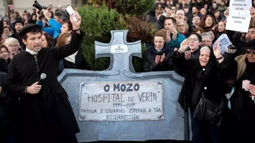 Cura, ataúd, coronas de flores naturales y cientos de plañideras debidamente ataviadas acompañan al coche fúnebre. Y lo hacen para cerrar una semana en la que se ha escuchado al presidente de la Xunta, Alberto Núñez Feijóo, advertir que esto "no tiene solución", mientras el PP de Ourense clamaba en dirección contraria; a los pediatras gallegos amparando la medida "por seguridad" y tras un encierro de profesionales y afectados en el mismo hospital. Hoy, se vuelven a escuchar en la calle las proclamas e incluso oraciones "por la resurrección" de los servicios de partos y pediatría.