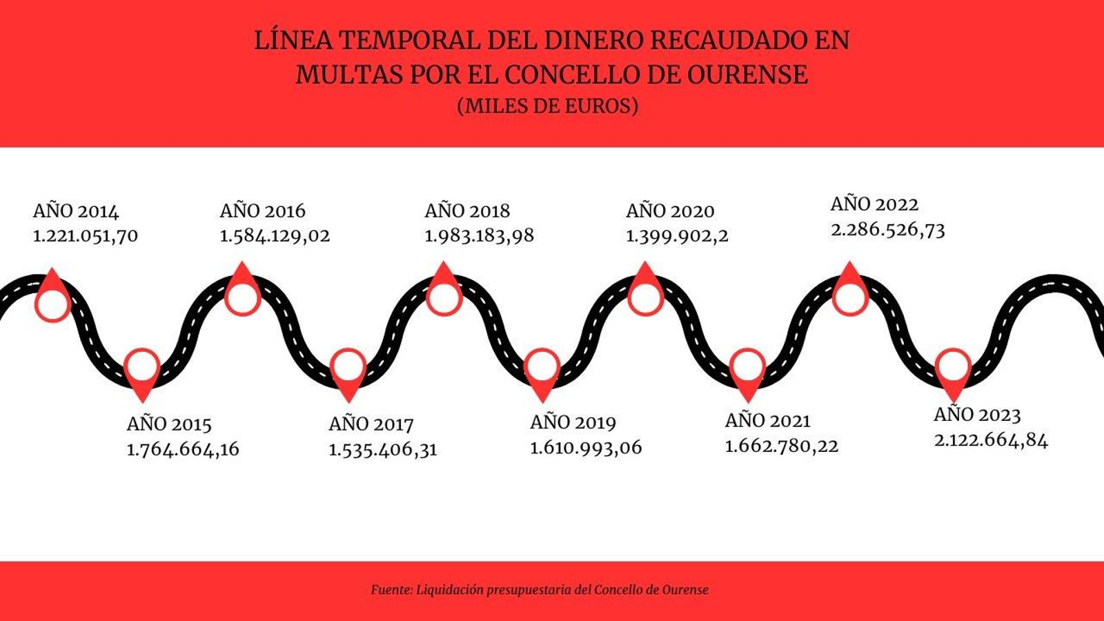 En 2022 y 2023 se superó la barrera de los 2 millones de euros recaudados por infracciones a la ordenanza municipal de tráfico, una barrera que solo se superó en ese bienio en los últimos 10 años, según los informes de ejecución presupuestaria del Concello.