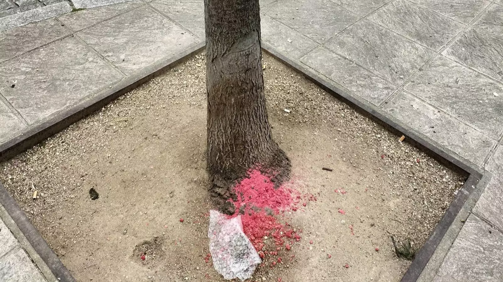 Una pequeña montaña de polvo rosa apareció ayer al pie de un árbol en la calle río Avia, en el barrio de Santa Teresita. Fueron los vecinos quienes dieron la alerta al colocar un cartel en el tronco para que los propietarios de mascotas que no se aproximasen.