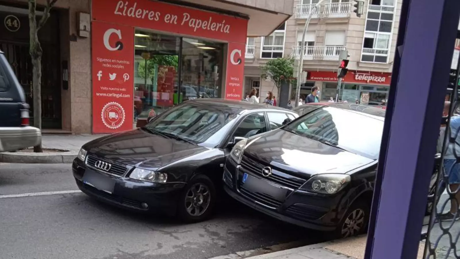 Dos coches quedaron dañados tras chocar lateralmente cuando circulaban por la calle Ervedelo de la ciudad. El incidente tuvo lugar este lunes por la mañana y según testigos presenciales, uno de los coches quiso esquivar un vehículo que estaba en doble fila y acabó golpeando al que venía por el carril contrario.