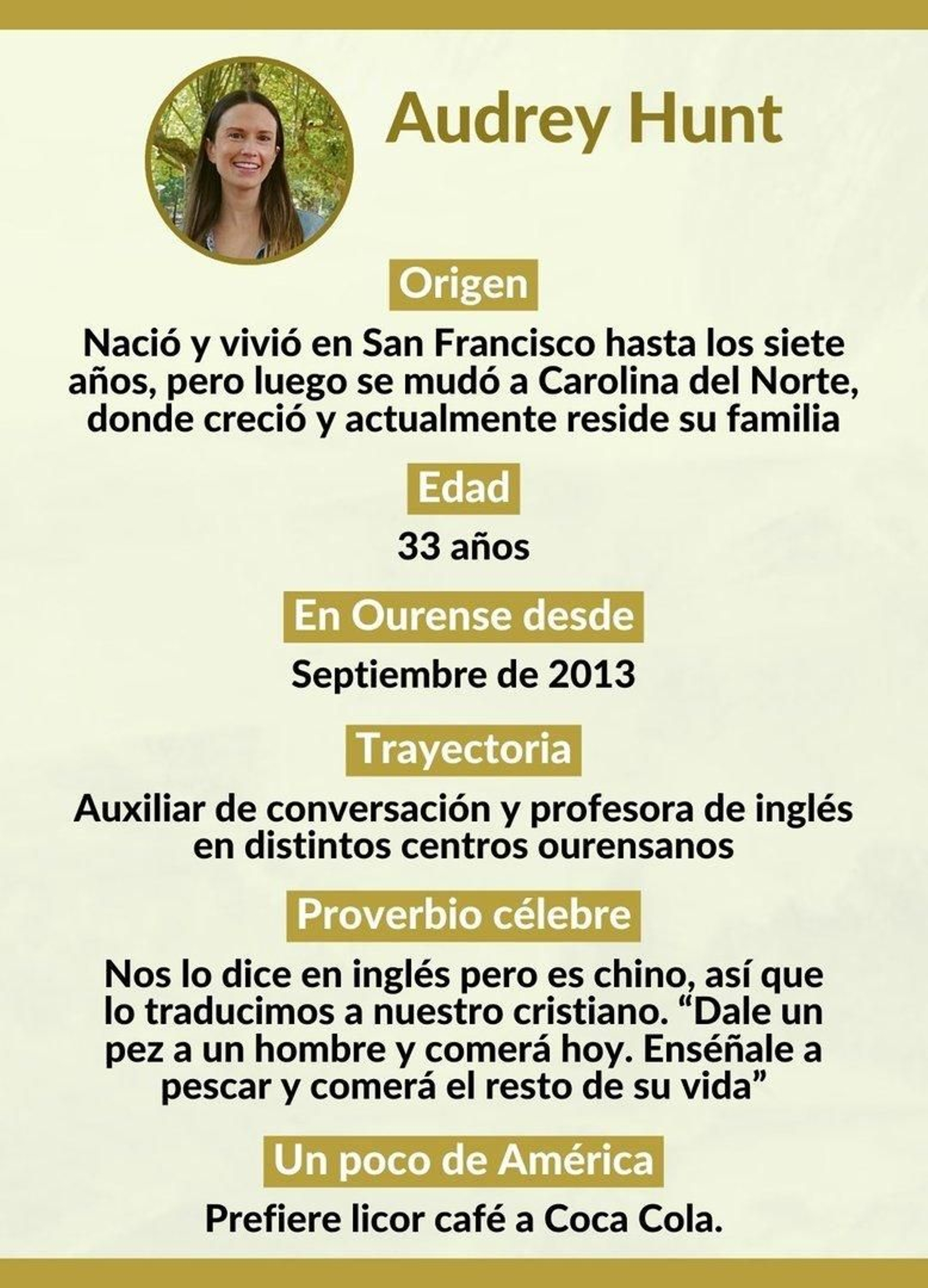 “¡Morriña!, es algo que además siento mucho cuando estoy fuera”, comenta Audrey Hunt. Natural de San Francisco, California, pero criada en Charlotte, Carolina del Norte, lleva once años en Ourense, y vive el sentimiento en su acepción de nostalgia de la tierra gallega. “Vine con una beca como auxiliar de conversación y estuve trabajando como tal hasta hace un año”, revela. Después estuvo en Divina Pastora Franciscanas, el colegio Miraflores y unos meses el año pasado en la escuela pública. Cuenta que estudió desde pequeña en un centro bilingüe por deseo de su madre, quien vivió un tiempo rodeada de hispanos en Los Ángeles, y que llegado el momento de volar del nido, se le ocurrió optar por esos programas. “En Estados Unidos cada vez hay más latinos y hablar su idioma te abre muchas puertas”, comenta.