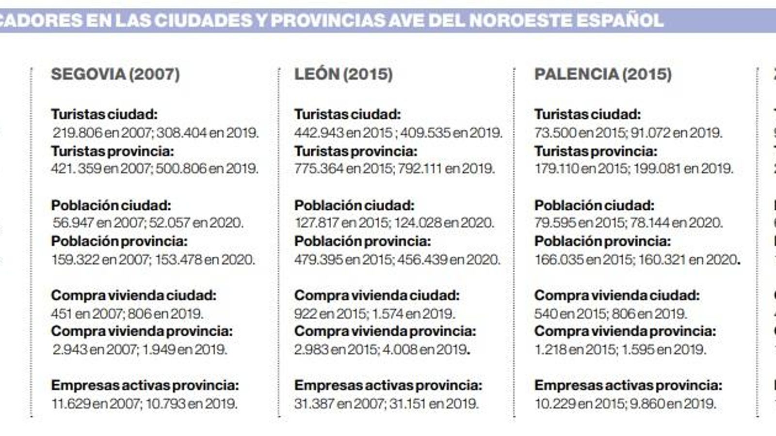Desde 2007, cinco capitales de provincia de Castilla y León encuadradas en el noroeste peninsular han recibido la llegada del AVE. Valladolid y Segovia empezaron aquel año, mientras que León, Zamora y Palencia lo estrenaron en 2015. Ninguna ellas tiene hoy más población que cuando llegó el tren rápido. En el caso de Valladolid, la ciudad perdió 17.000 habitantes desde entonces, pero la provincia consiguió mantener números, lo cual demuestra que el polo de atracción se va hacia su entorno. Un efecto muy diferente al de León, donde en cinco años de AVE la ciudad ha perdido algo más de 2.000 vecinos, pero el conjunto de la provincia se ha desplomado. Inercias similares a la baja tanto en ciudad como provincia han sufrido en tierras zamoranas, palentinas y segovianas.