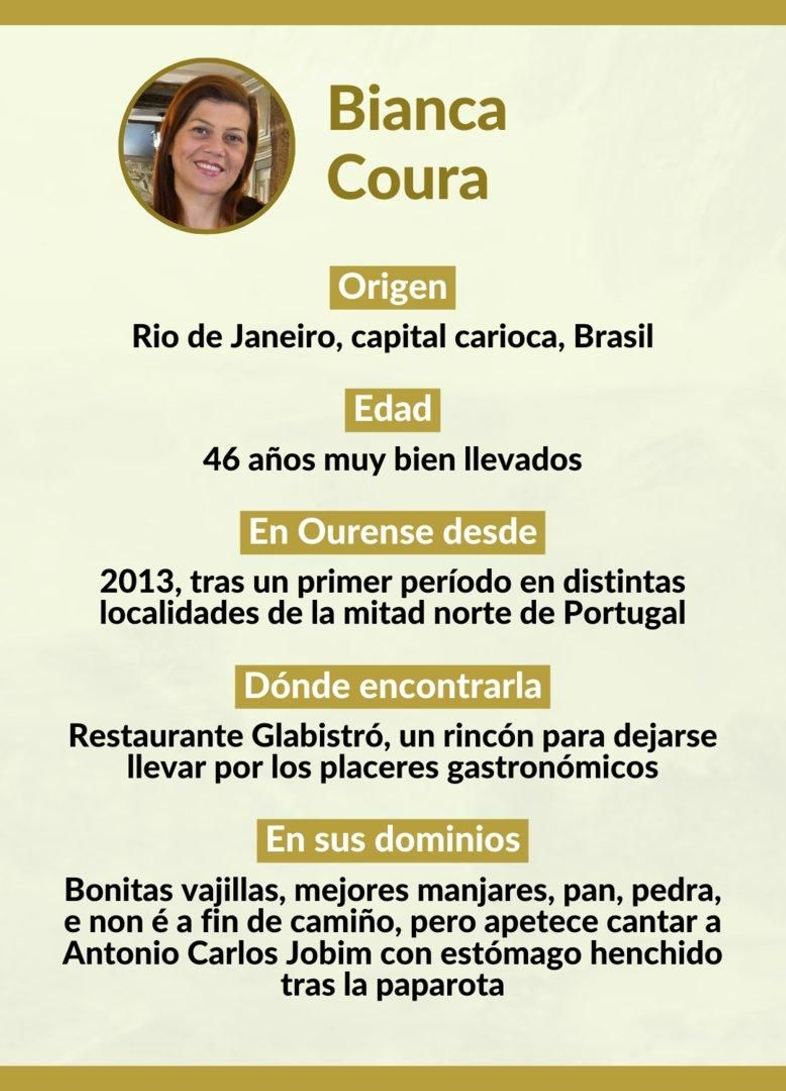 Enamorada de Ourense a primera vista, Bianca Coura es una carioca ourensana por derecho y atracción por estas tierras. Realizada en lo profesional, observa paciente el rédito de sus esfuerzos, mientras en su cabeza se van cocinando planes nuevos