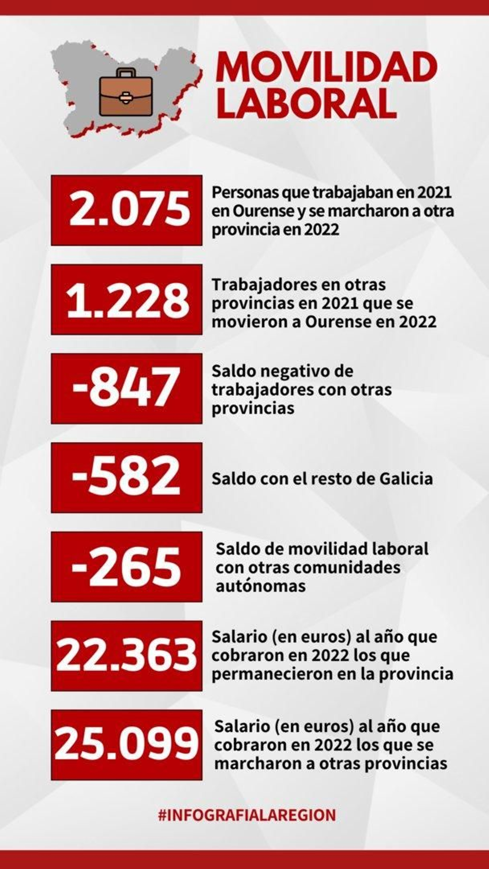 En Ourense se ceden trabajadores a otras partes de España, pero, sin embargo, provincia también pierde en este sentido en el interior de la comunidad autónoma gallega, ya que presenta saldo migratorio negativo con las otras provincias salvo con Lugo. Así, de los 2.075 trabajadores que se marcharon de la provincia, un total de 1.329 lo hicieron a la misma comunidad autónoma y 746 se fueron a otra provincia de España.