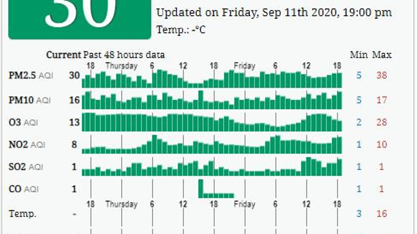 Como podemos ver en la tabla de datos de la página aqicn.org, los datos en tiempo real para este viernes convierten el valor del ICA en 30, casi el doble de la que figura en el mapa, sin embargo, al ser unidades tan bajas, la diferencia es mínima. En esta tabla no solo vemos un dato final, también arroja los datos de cada una de las sustancias perjudiciales que se miden en las estaciones.