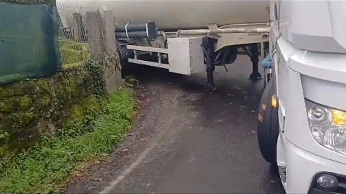Este jueves, ha sido un camión portugués el que ha obligado a cortar el tráfico en esta carretera de Rivela. Uno de los vecinos del lugar asegura que en lo que en menos de 5 meses, ya han sido 3 los camiones que han encallado tratando de girar por esta vía. En algunas ocasiones logran maniobrar para salvar el escollo, en otras arrasan con uno de los muros o el quitamiedos para poder continuar su camino. En esta ocasión, ha tenido que trasladarse una grúa hasta el lugar para liberar al camión.
