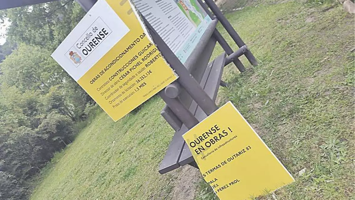 Uno de los carteles y varias vallas que rodean las termas de Outariz aparecieron ayer destrozados. Este episodio de vandalismo ocurrió por la noche, ya que el personal de vigilancia encontró los estragos por la mañana.