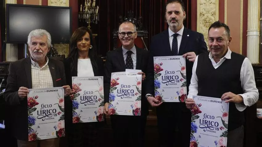 "Será unha oportunidade única de vivir a lírica desde a máis rica das heterodoxias, no referente a estilos e xéneros", destacó el alcalde de la ciudad, Jesús Vázquez, acompañado en la presentación por el vicepresidente de la Diputación, Rosendo Fernández; la edil de Cultura, Belén Iglesias; el profesor del Conservatorio Superior de Música de Vigo Roberto Relova y el responsable de Abanca en Ourense, Rubén Saavedra.