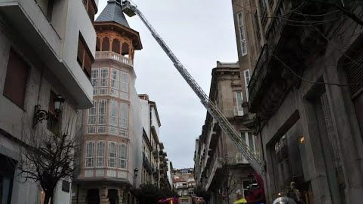 El histórico edificio del antiguo Hotel Miño, en la confluencia del Paseo y Cardenal Quiroga, lleva años dando síntomas de agotamiento y en las últimas horas se ha agravado su estado al desprenderse la corona del templete del inmueble, obra del arquitecto Daniel Vázquez Gulías, que ha firmado construcciones de relieve por la ciudad.