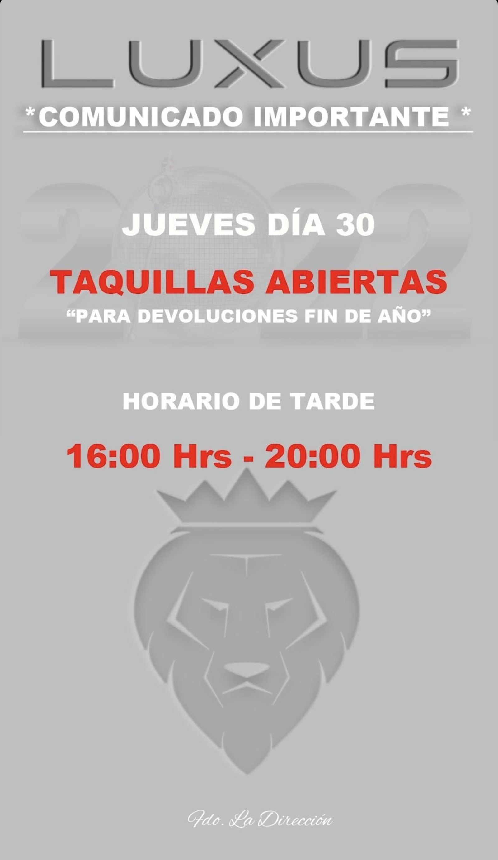 Horas después de publicar el comunicado, en el que aseguraba que procedería a la devolución del importe de las entradas para la fiesta de Fin de Año, la Luxus indicaba que su taquilla permanecería abierta para ello el jueves 30 de diciembre entre las 16:00 y las 20:00 horas.