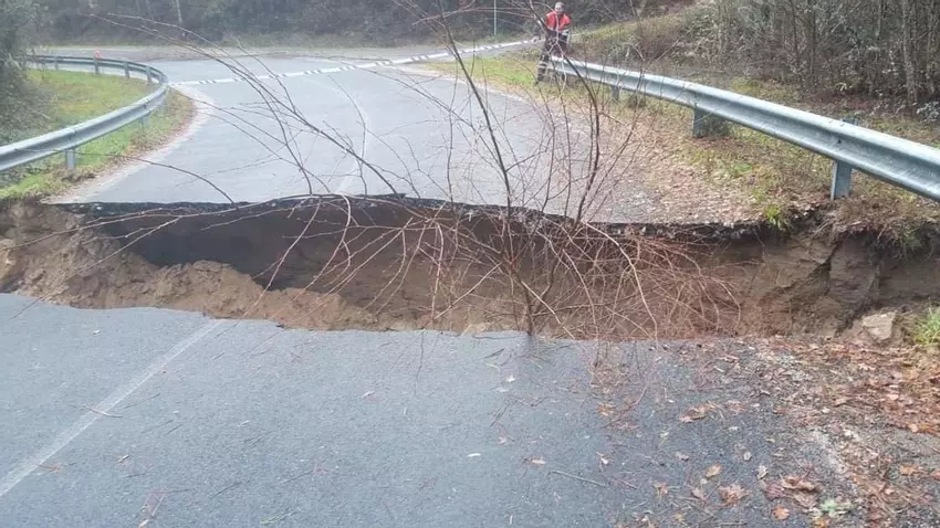 Los destrozos de Fabien no cesan en Ourense donde esta mañana se cortaba la carretera OU-1202 (Farnadeiros-Lobios) a la altura del punto kilométrico13,500 por hundimiento de la calzada. Se han habilitado desvíos por pistas locales y el lugar ha quedado señalizado por efectivos de Protección Civil de Muiños.