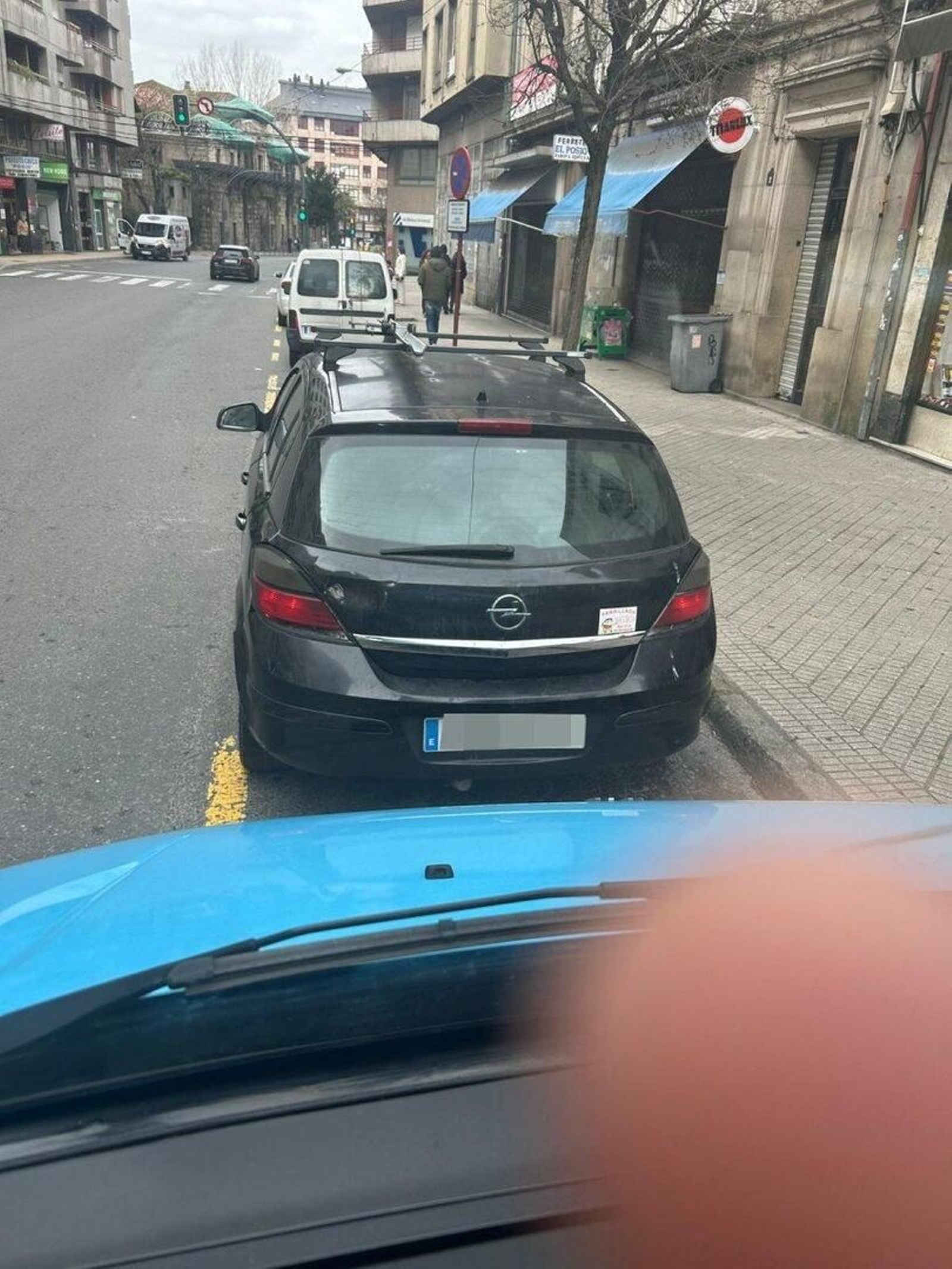 Miren qué bien aparcado está ese coche. Así todos los días, en una curva y paso de peatones entre las calles San Rosendo y Jesús Pousa. Aquí cada uno aparca donde le da la gana.