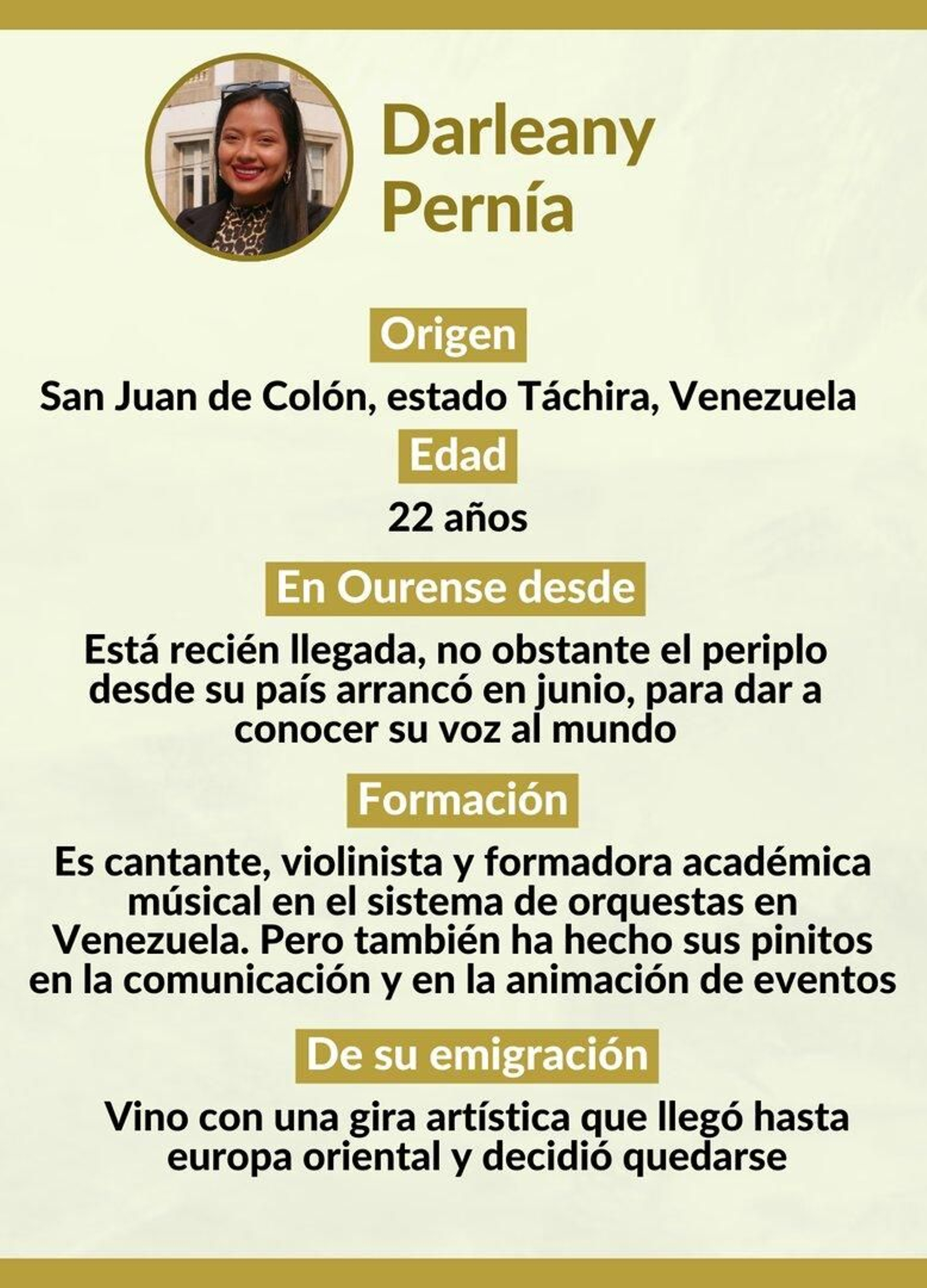 Tiene veintidós años, entró en Europa con una gira y en Ourense decidió afincarse. “Salí en junio por el aeropuerto de Maiquetía en busca de materializar un sueño, conocer el mundo y que el mundo conozca mi voz”, enuncia. Grandes palabras, mejores intenciones.