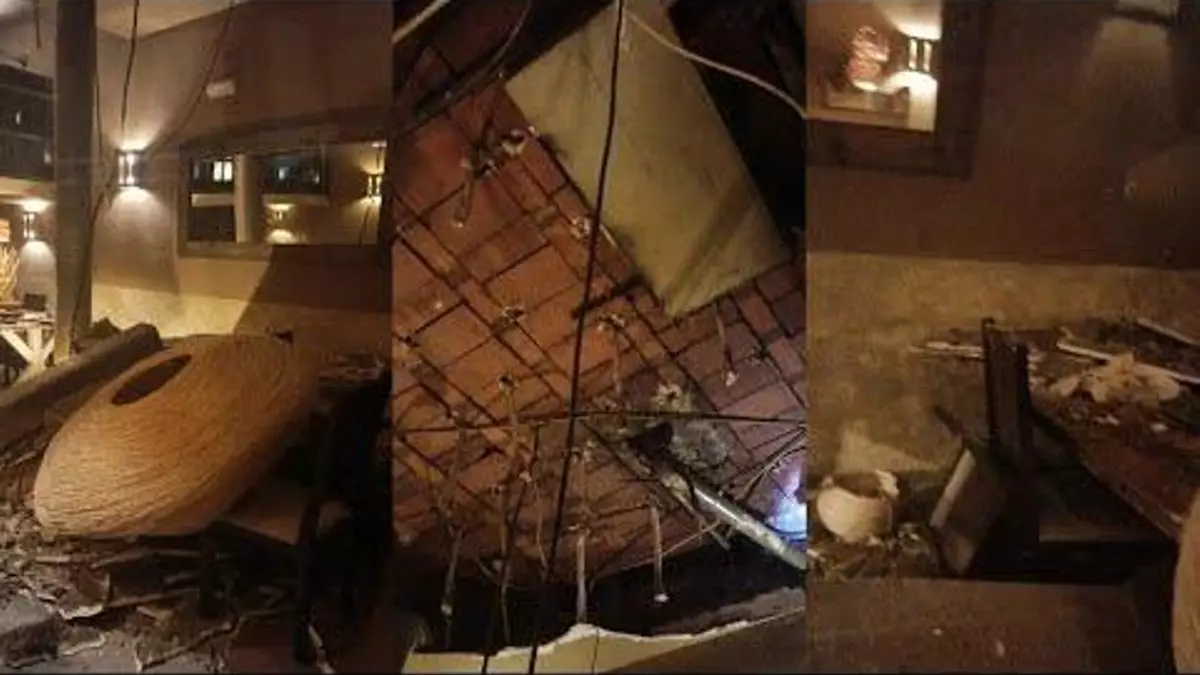 En cuestión de segundos, se derrumbó parte del techo y comenzaron a caer de la parte superior pedazos del mismo, así como lámparas y otros objetos colgantes, precipitándose sobre el suelo y dejando mesas y vajillas destrozadas. Un auténtico desastre.