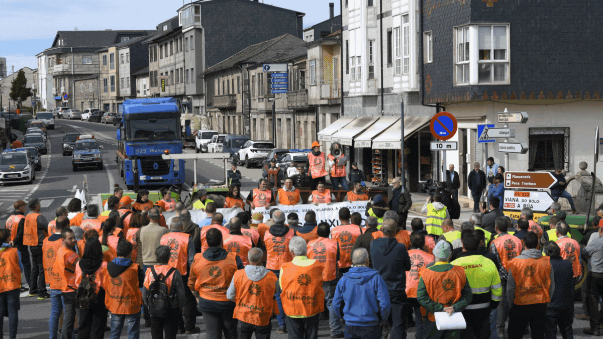 Agricultores y ganaderos de Viana do Bolo, A Mezquita, A Gudiña, Vilardevós o Riós protestan en A Gudiña, puerta de entrada a Galicia por Ourense. Han conseguido interrumpir el tráfico en la intersección entre la N525 y la OU533. El lema de su protesta es "Polo futuro do sector produtor, menos burocratización, prezos xustos".