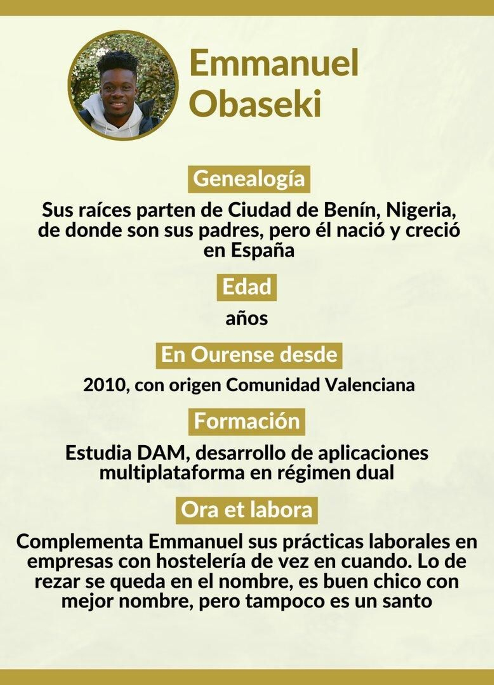 Vecino del barrio de O Vinteún desde hace catorce años, Emmanuel Obaseki Imafidon es un español de Valencia con raíces de África occidental, que sabe mejor gallego que cualquier lengua de Nigeria. “Lo entiendo a la perfección pero no lo hablo; en casa, mis padres se comunican más en inglés, o español, por mi hermano de cuatro años”, explica. Ambos progenitores son originarios de Ciudad de Benín, en Nigeria, y hará más o menos un cuarto de siglo que emigraron.