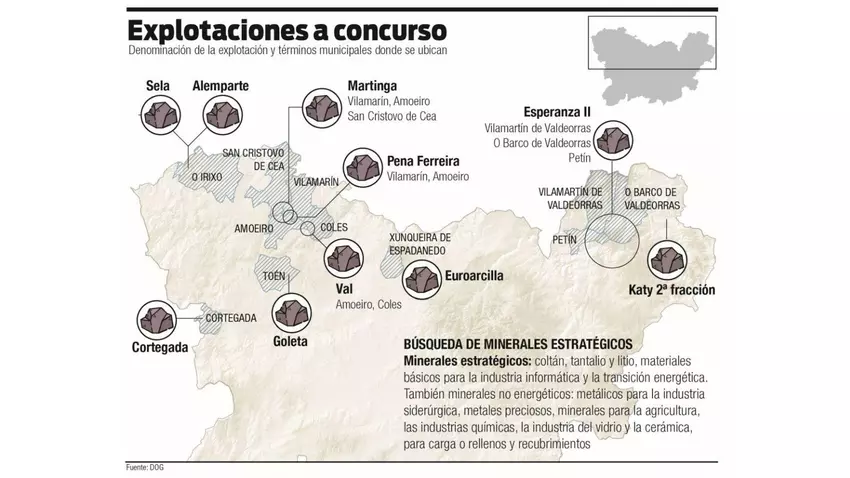 El DOG recoge también la exclusión del concurso de la empresa Áridos Astariz por deficiencias en la documentación administrativa, por lo que finalmente, los derechos de sondeo de nueve antiguas explotaciones fueron declarados desiertos.