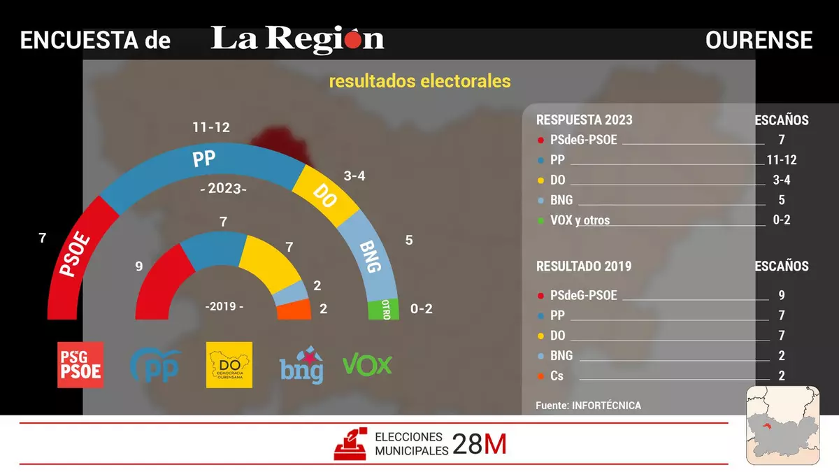 Donde el descenso se acentúa es en DO, ya que el partido de Gonzalo Pérez pierde cuatro concejales respecto a 2019 y se queda en sólo 3. Infortécnica señala que la tendencia se agudiza en las últimas jornadas y se incrementa el descenso del número de posibles votantes.
