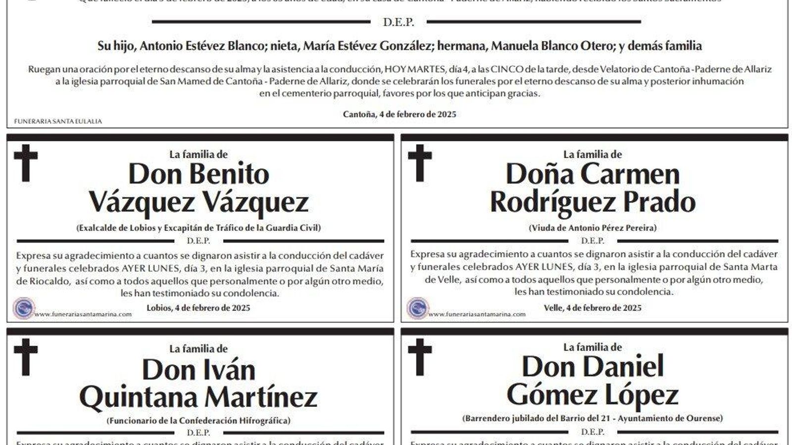Los familiares han querido dejar un mensaje de despedida y han plasmado sus deseos en estos últimos mensajes que recogen las esquelas de La Región. Este martes son mensajes para Doña Pura Blanco Otero, Don Benito Vázquez Vázquez, Doña Carmen Rodríguez Prado, Don Iván Quintana Martínez y Don Daniel Gómez López.
