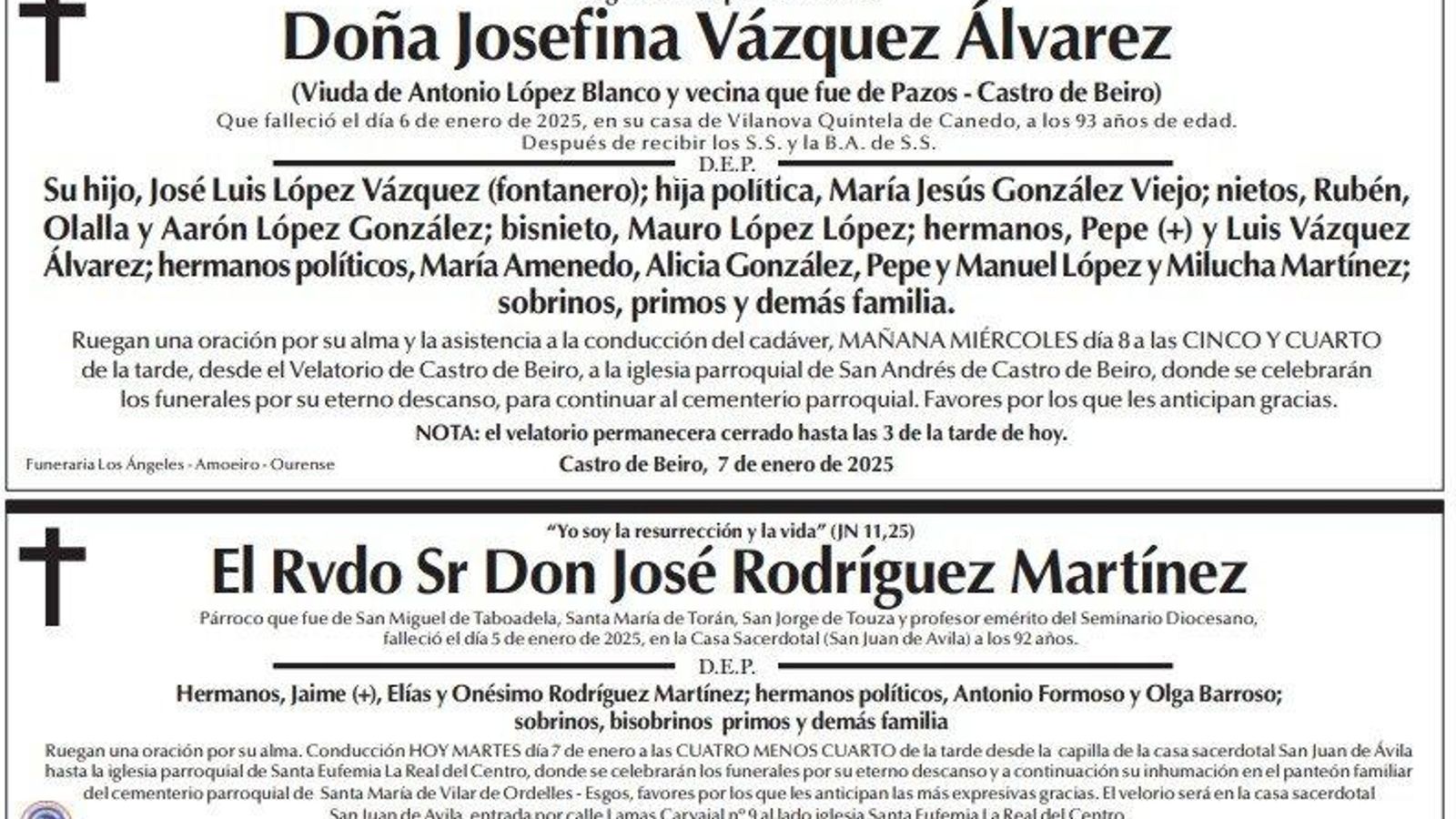 Los familiares han querido dejar un mensaje de despedida y han plasmado sus deseos en estos últimos mensajes que recogen las esquelas de La Región. Este martes son mensajes para Doña Josefina Vázquez Álvarez y el Reverendo Señor Don José Rodríguez Martínez.