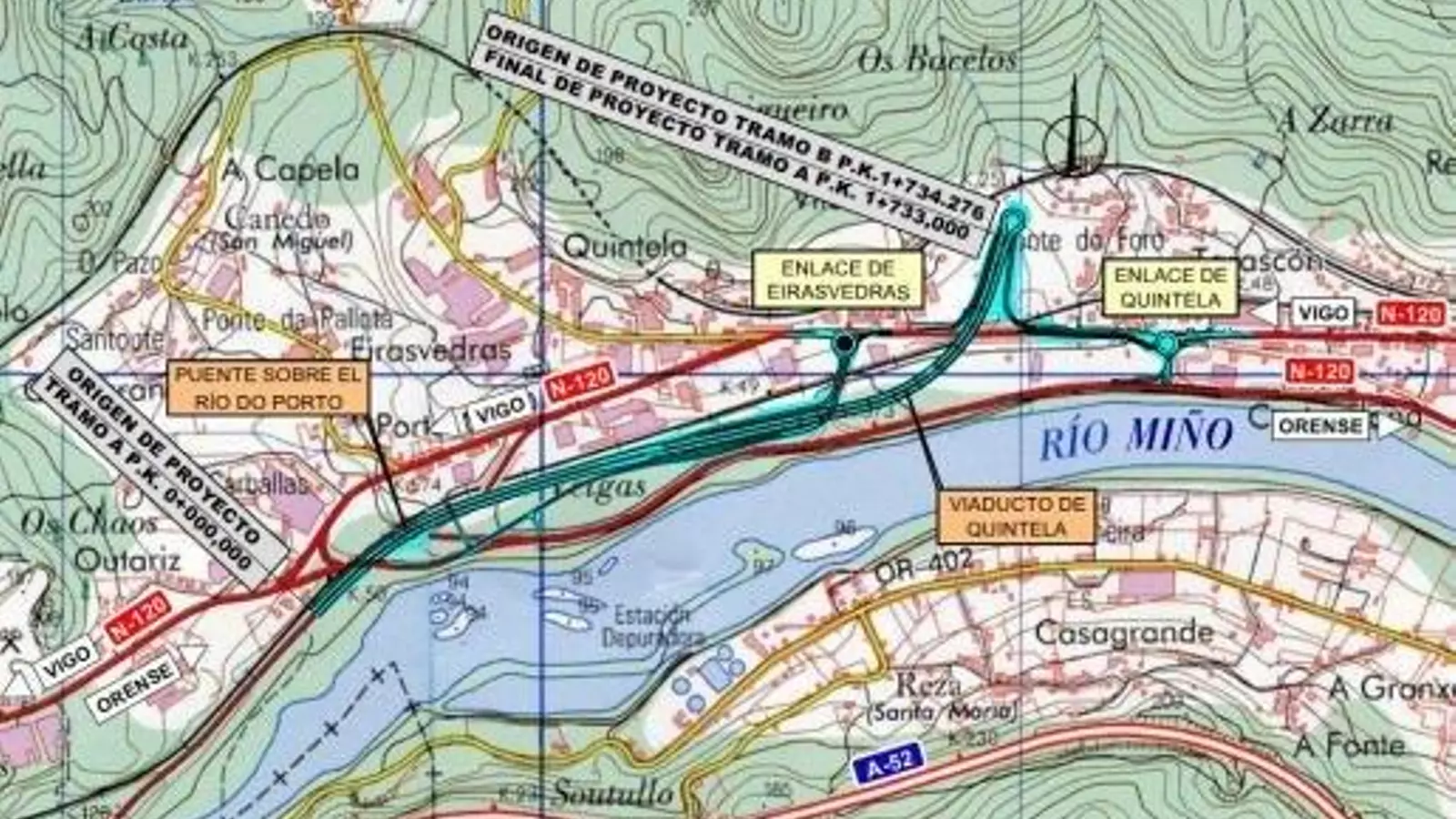 Según indica el Ministerio, este primer tramo, que incluye como obras singulares un viaducto sobre la N-120 y la línea ferroviaria Monforte de Lemos - Vigo (viaducto de Quintela), un nuevo puente sobre el río y dos pasos inferiores y que se integrará en la futura autovía A-56 entre Ourense y Lugo, tiene su origen en el entorno del actual enlace de Eirasvedras de la A-52.