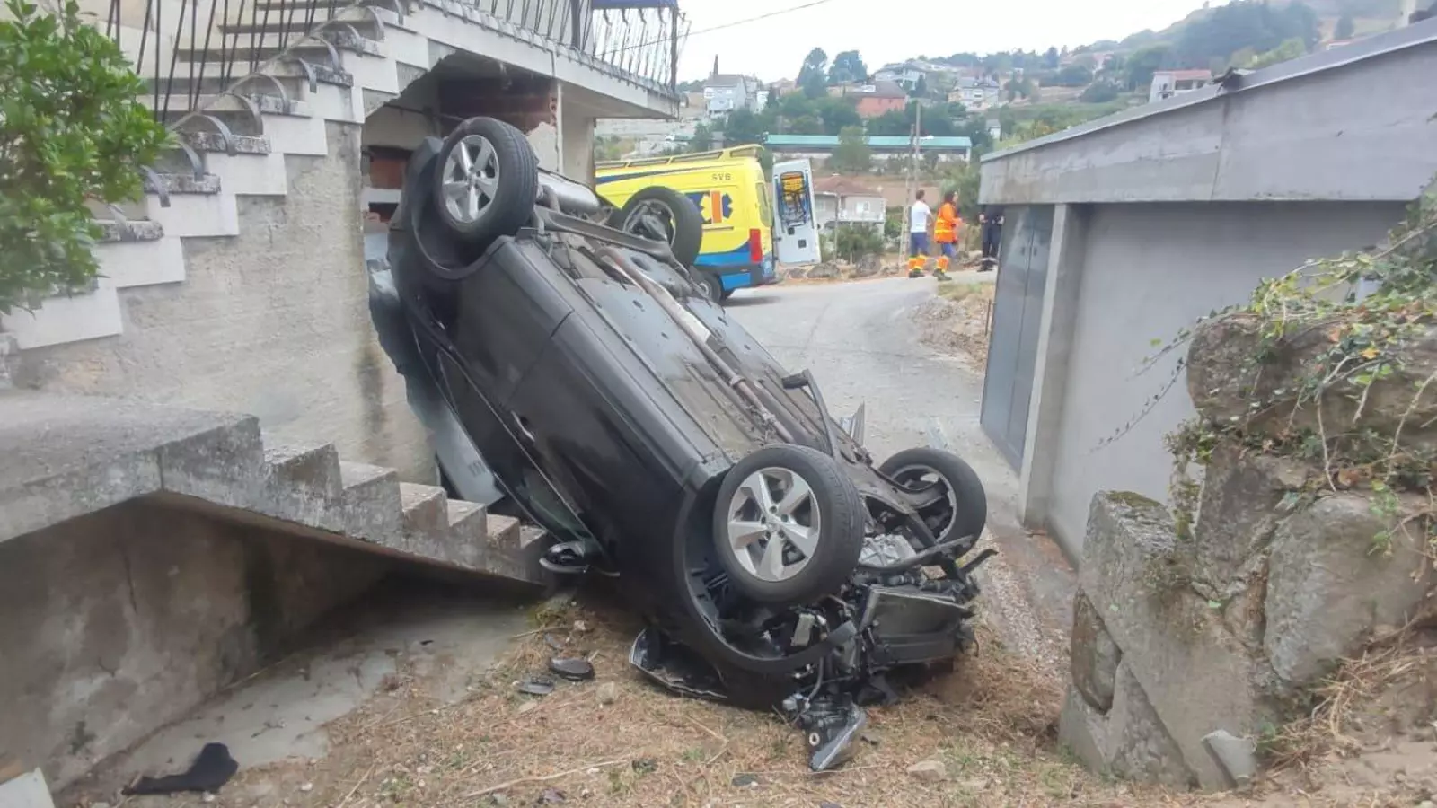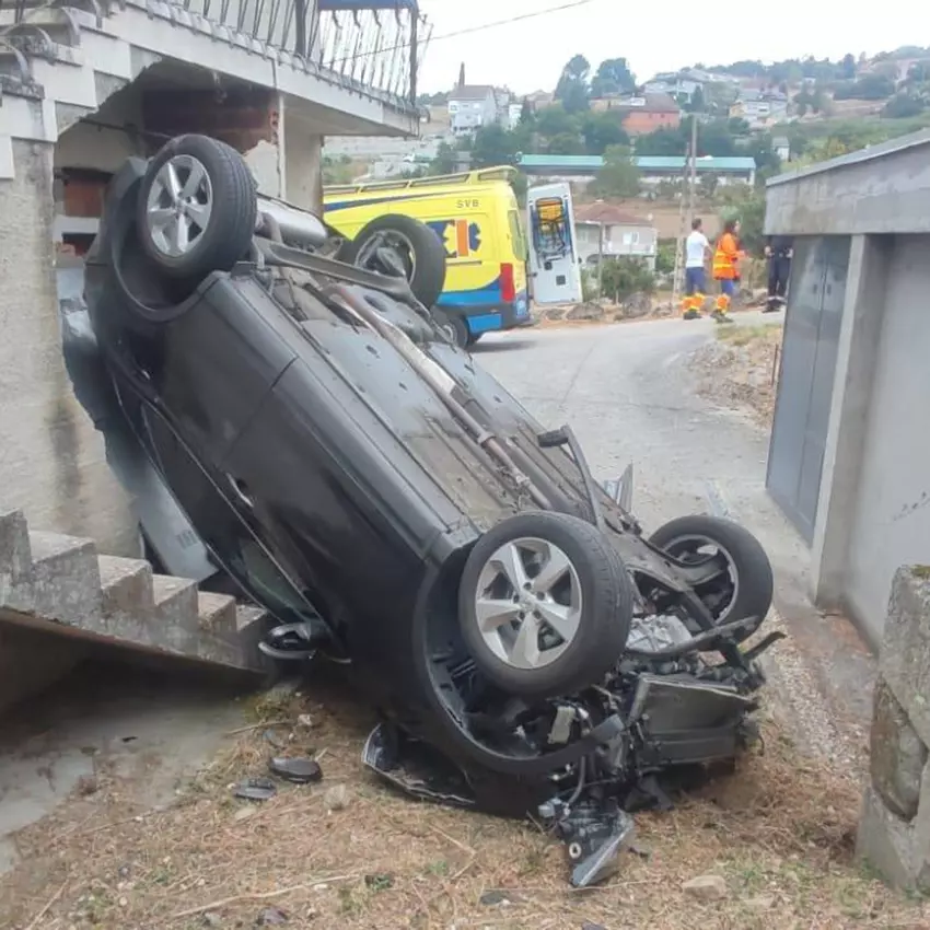 Un coche acabó impactando esta mañana contra el muro de una vivienda. El vehículo, por causas que se desconocen, se salió de la vía y acabó volcado en el patio interior de la casa, situada en Outeiro (Cudeiro).