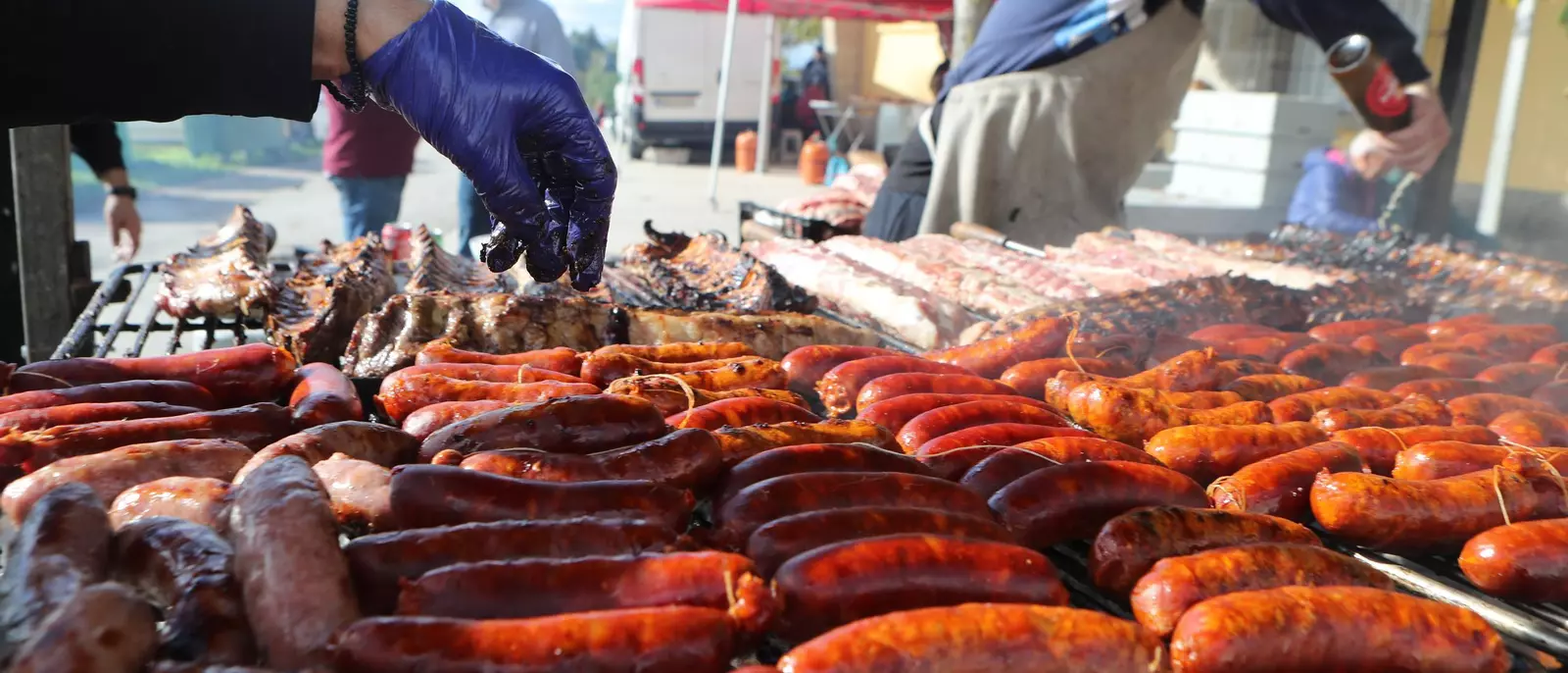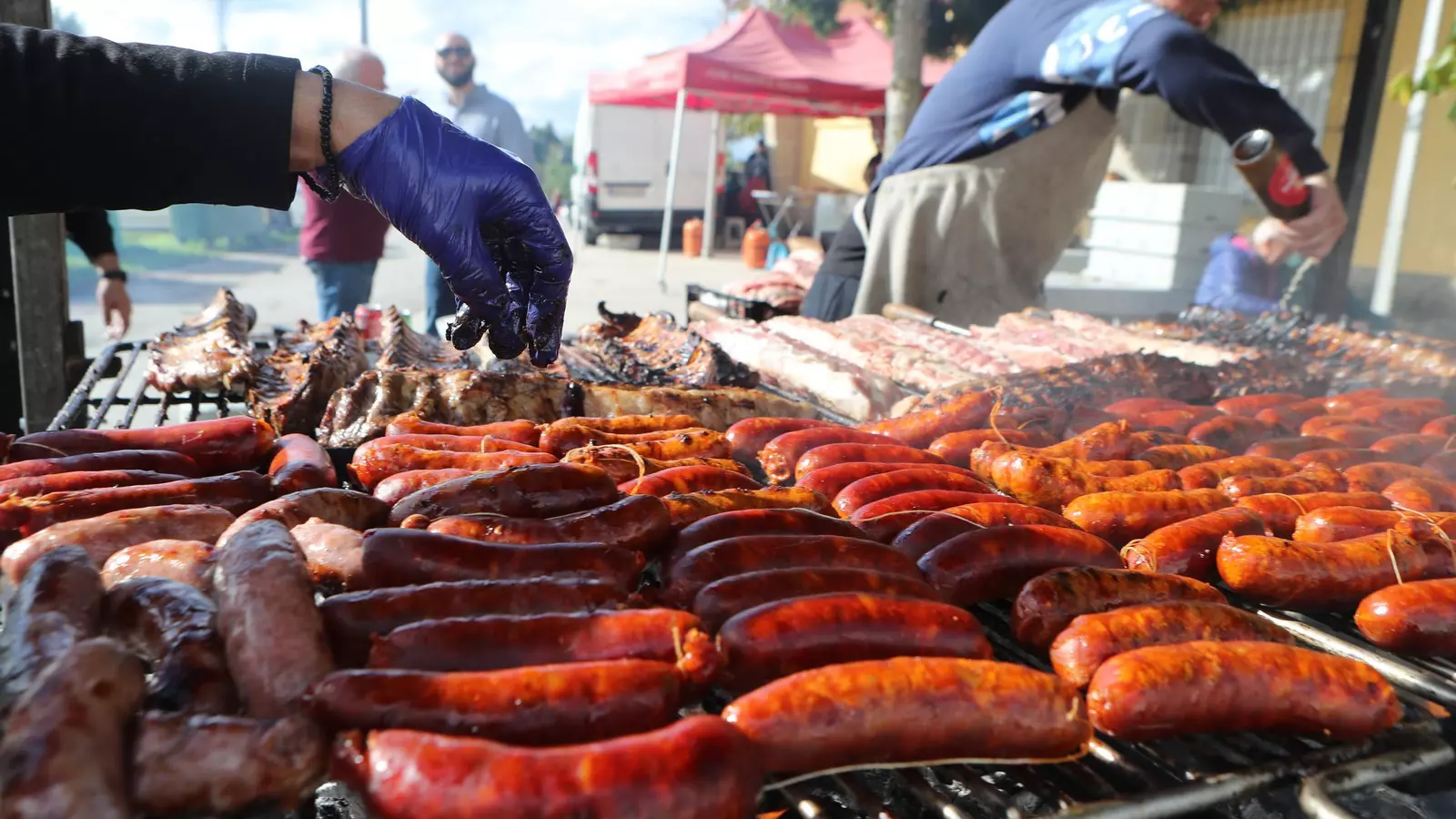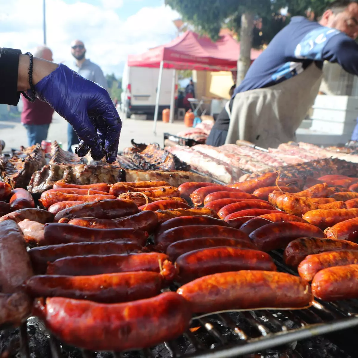 Trabajan a destajo para asar toda la carne y chorizos que van a disfrutar en Castro de Beiro.