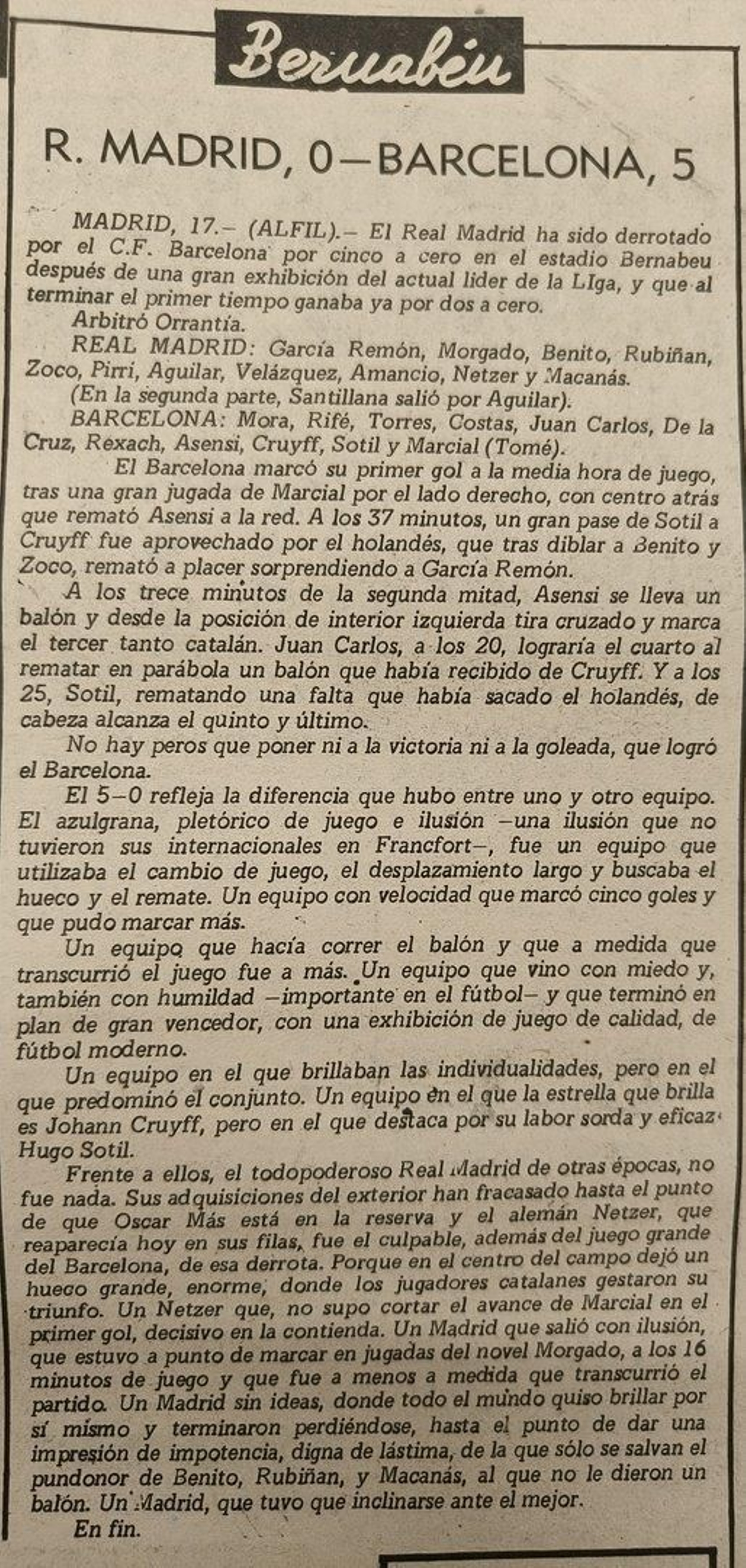 - El Barcelona se impone al Real Madrid en el Bernabéu por 0-5 con una exhibición de juego como no se recordaba y goles de Asensi (2), Cruyff, Juan Carlos y Sotil.