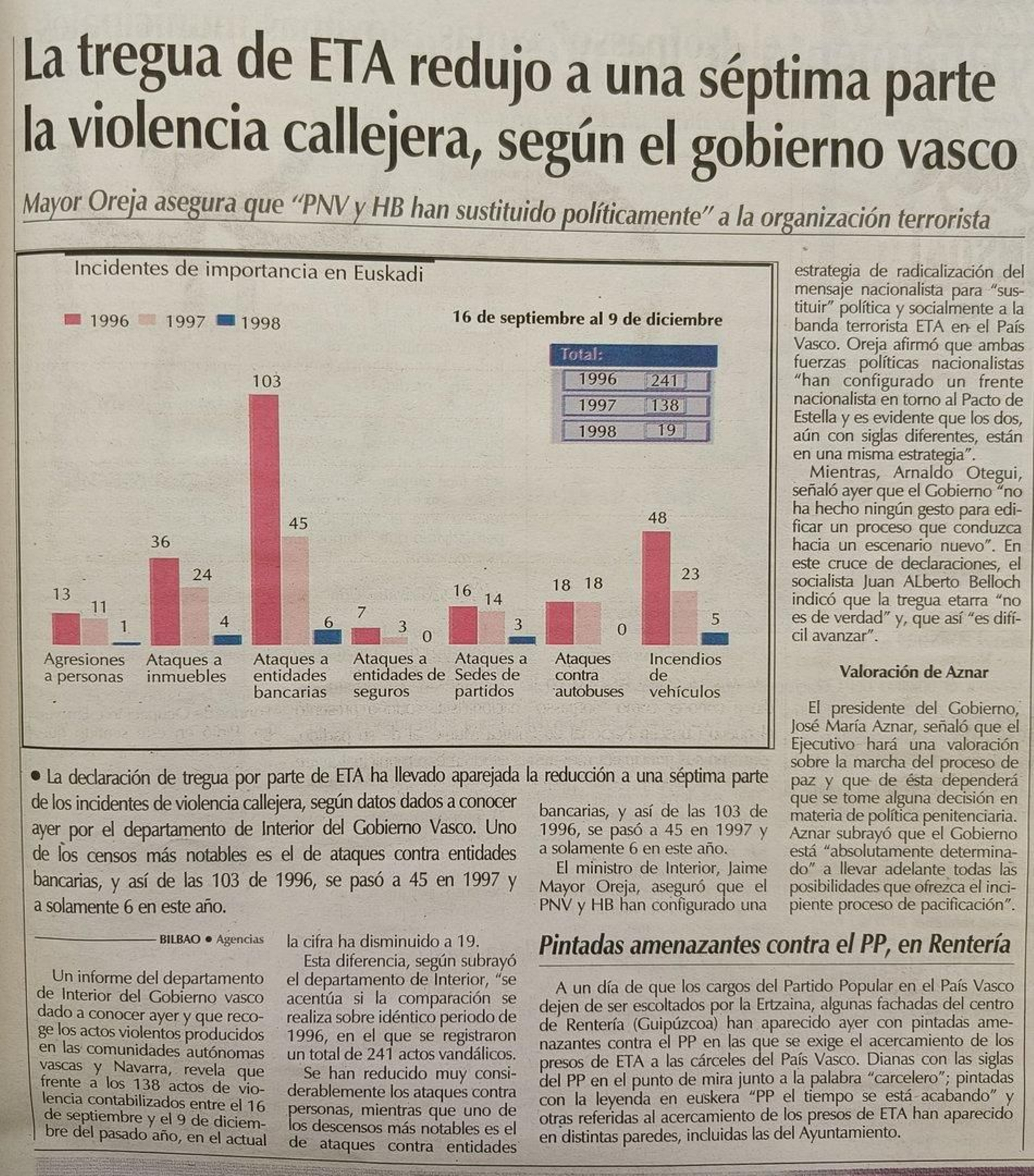 La tregua declarada por la banda terrorista ETA reduce la violencia callejera en el País Vasco a una séptima parte, según el departamento de Interior del Gobierno vasco, que dio como ejemplo los ataques a oficinas bancarias que pasaron de 103 en 1996 a 45 en 1997 y solamente 6 en lo que va de año 1998, reduciéndose también “muy considerablemente” los ataques a personas.