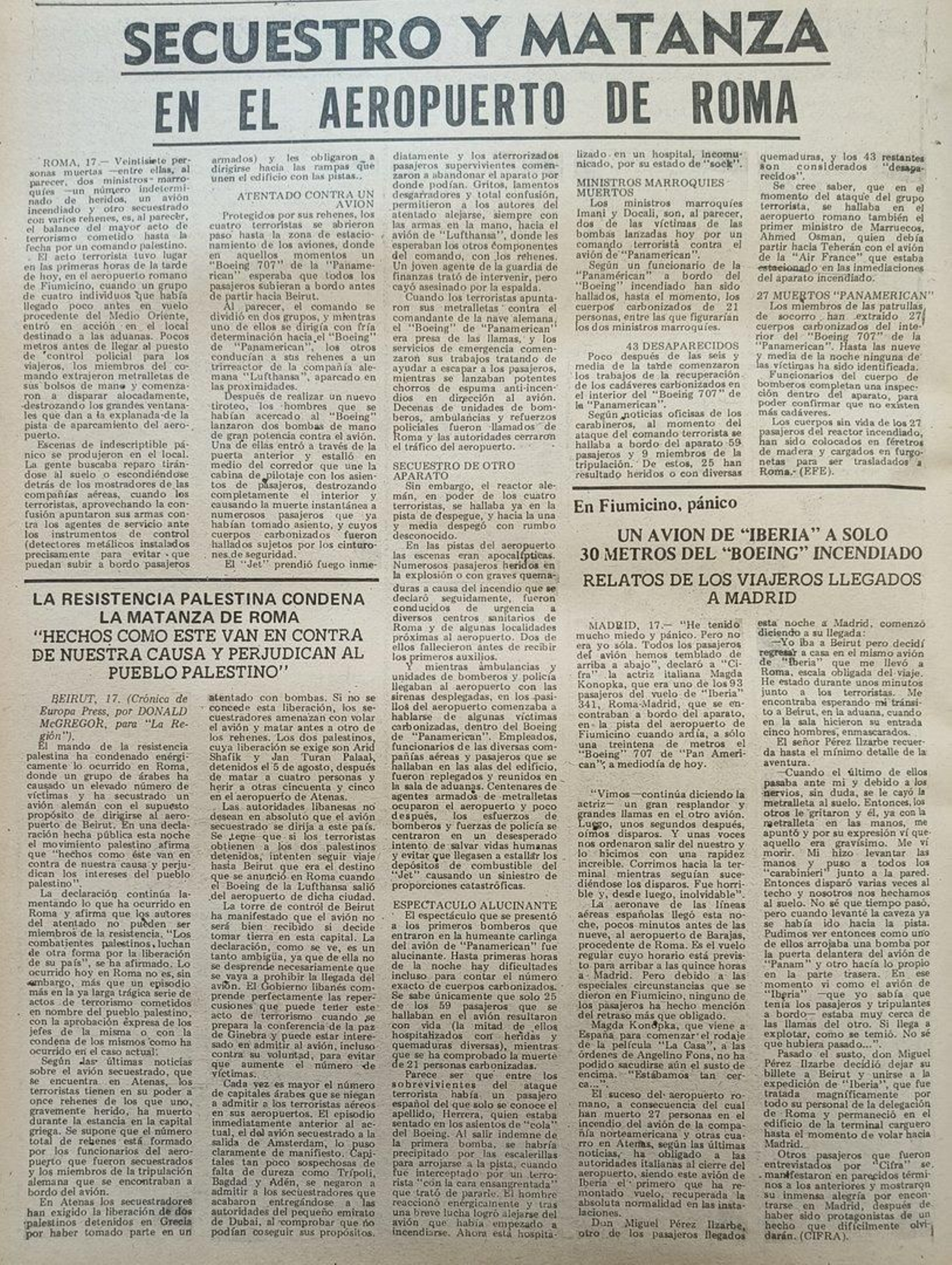 Un comando palestino siembra el pánico en el aeropuerto de Roma y deja al menos 27 muertos al hacer explotar con bombas de mano un avión de la compañía Panamerican que iba a partir hacia Beirut. El comando, formado por cuatro hombres, irrumpió a tiros en el aeropuerto y se hizo con varios rehenes, dirigiéndose con ellos hacia la pista de despegue. Allí, y en medio de un fuerte tiroteo, lanzaron las bombas contra el avión y acompañados de sus rehenes subieron a bordo de otro avión de la compañía Lufthansa en el que partieron con rumbo desconocido. Hay dos ministros marroquíes entre las víctimas mortales en el que ya es el atentado terrorista más grave cometido hasta ahora por un grupo palestino.