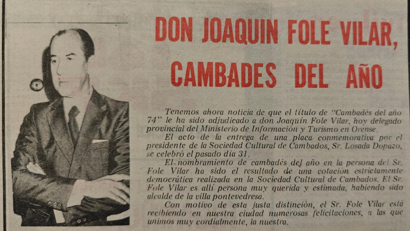 -Don Joaquín Fole Vilar, actual delegado provincial del Ministerio de Información y Turismo en Orense, es nombrado “Cambadés del año 1974” por la Sociedad Cultural de Cambados (Pontevedra).