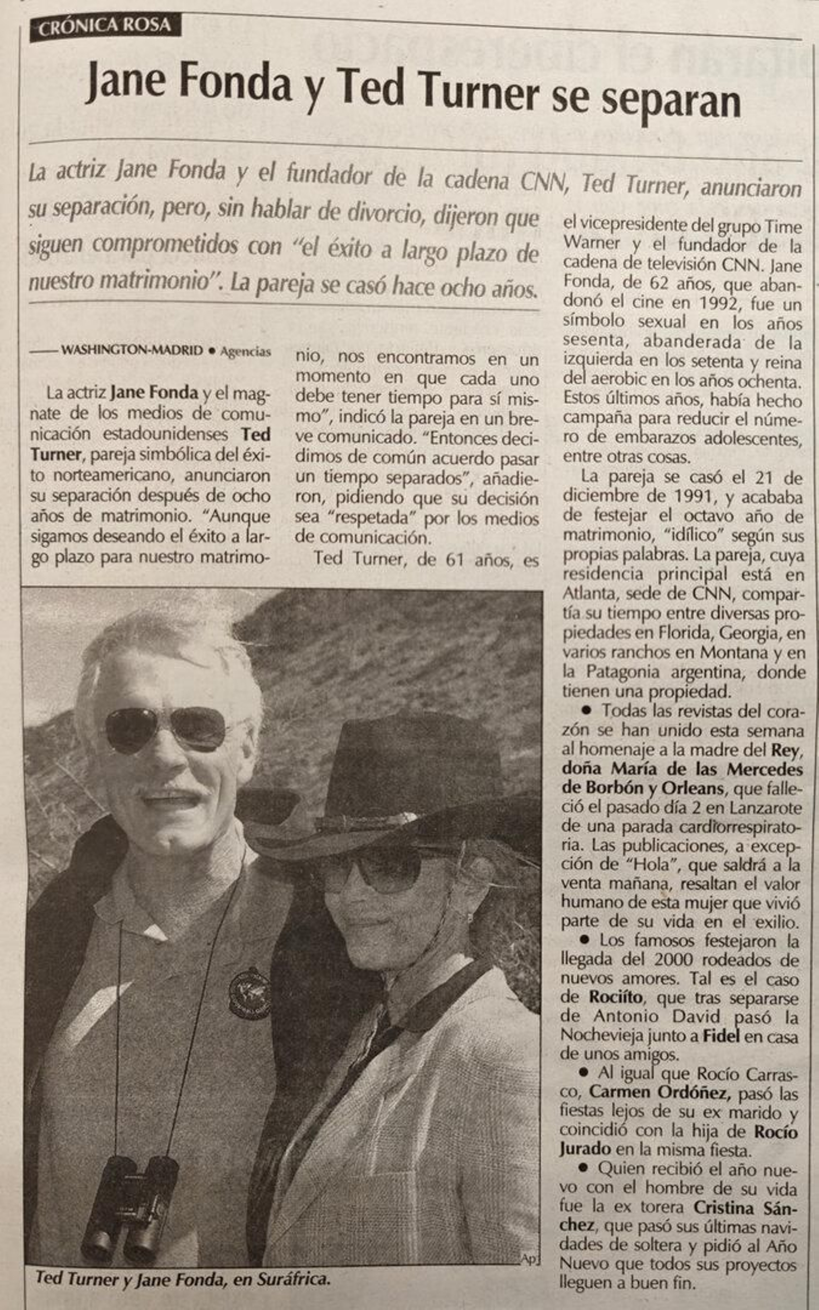 -La actriz Jane Fonda y el magnate de los medios de comunicación Ted Turner anuncian su separación después de ocho años de matrimonio.