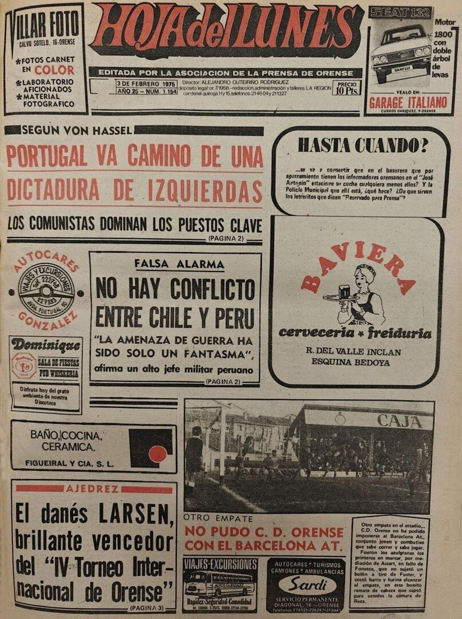 -El director de La Región, don Alejandro Outeiriño, es finalmente absuelto del delito de desacato al presidente de la Diputación provincial y se le considera, en sentencia definitiva de la Audiencia provincial, tan solo responsable de una falta, con multa de 1.000 pesetas y “reprensión privada”. Los hechos se remontan a enero de 1974, cuando apareció en La Región un comentario titulado “La Cultura o la No Cultura” firmado por don Alejandro Outeiriño en el que se criticaba “en tono jocoso” la supresión del Aula de Cultura por parte del entonces presidente de la Diputación, don Eduardo Olano Gurriarán.