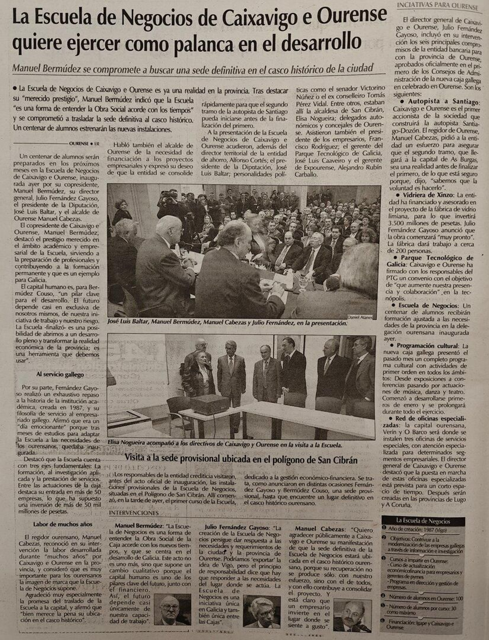 -Caixavigo e Ourense pone en marcha su Escuela de Negocios en nuestra provincia, instalada provisionalmente en el Polígono de San Cibrán y financiada por el Igape y la entidad, dando continuidad a la Escuela creada en 1987 en Vigo y ofreciendo formación en los próximos meses a un centenar de alumnos en Ourense.