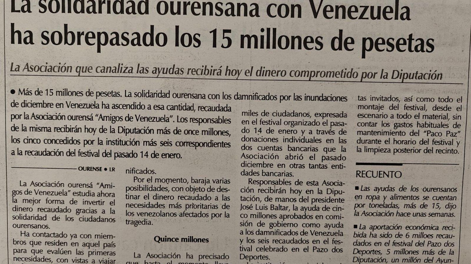 La Asociación ourensana “Amigos de Venezuela” recauda más de 15 millones de pesetas para ayudar a los damnificados por las inundaciones en el país sudamericano, entre ayudas de instituciones públicas como Diputación y Ayuntamiento, donaciones de empresas y la solidaridad de los ourensanos.