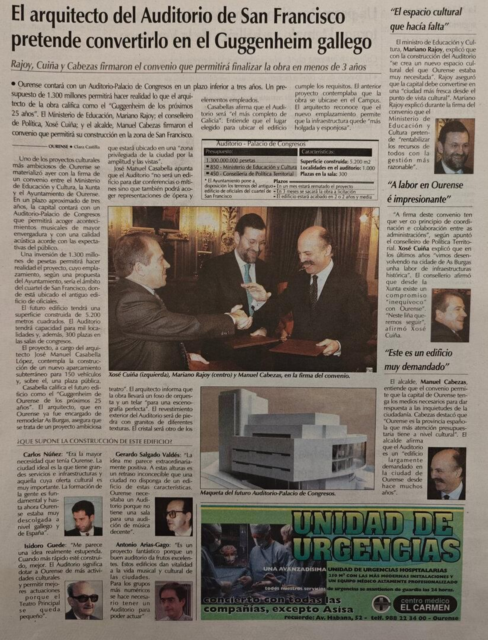 El ministro de Educación, Mariano Rajoy; el conselleiro de Política Territorial, Xosé Cuiña, y el alcalde, Manuel Cabezas, firman en Ourense el convenio para la construcción del futuro Auditorio-Palacio de Congresos en San Francisco, con un presupuesto de 1.300 millones de pesetas y un proyecto del arquitecto José Manuel Casabella, que calificó al futuro edificio como “el Guggenheim gallego” y prometió que estará listo antes de tres años.