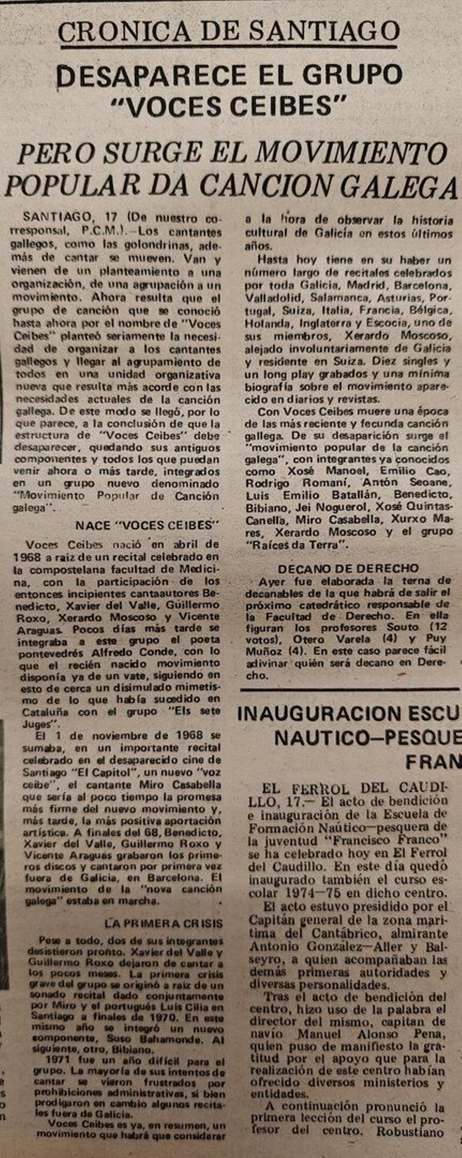 -Desaparece la agrupación Voces Ceibes, gran impulsora de la música gallega que nació en Santiago en 1968 de la mano de autores como Vicente Araguas, Xavier del Valle, Guillermo Roxo, Xerardo Moscoso o Alfredo Conde y que ha publicado discos y ofrecido recitales en España y en el extranjero, dando lugar a lo que ya se conoce como “Nova canción galega”, con nombres como Suso Bahamonde, Emilio Cao, Antón Seoane, Miro Casabella o el grupo Raíces da Terra.