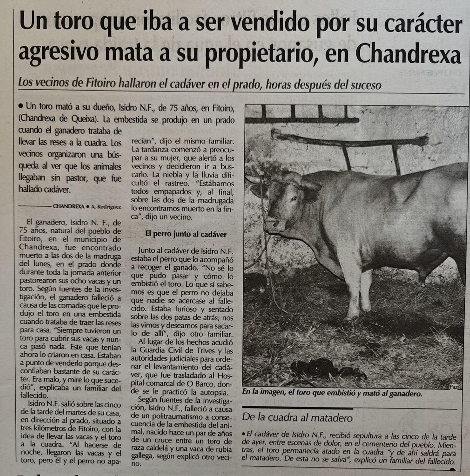 Un ganadero de 75 años muere en Fitoiro (Chandrexa de Queixa) al ser embestido por un toro de su propiedad que iba a ser vendido en breve “por su carácter agresivo”.