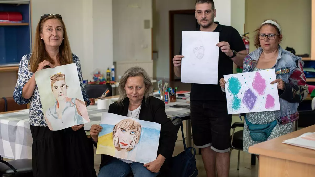 Ana E. Parro, que acaba de pintar con acuarelas su autorretrato, explica la experiencia didáctica: “Trajo una foto impresa, en blanco y negro para ver mejor las sombras, y nos explicó cómo trasladar las proporciones de la cara para trabajar en papel grande”.