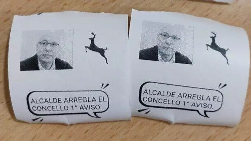 En los carteles recogidos, cuya autoría todavía se desconoce, hay una foto en blanco y negro de Valcárcel, un dibujo de un ciervo y el mensaje "Alcalde arregla el Concello 1º aviso".